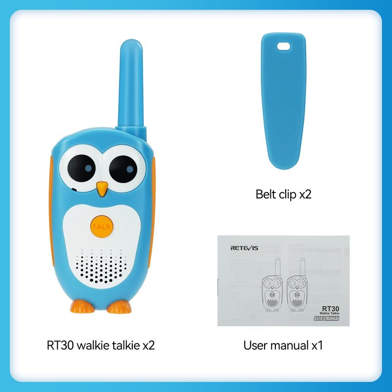 Retevis RT30 Kids Walkie Talkies, Accompany children to grow up. The look uses blue owl design and the material uses ABS, which make the walkie talkie cute and secure for kids to use. Kids easily talk with their friends by pressing the Talk button in the middle of the 2-way radio. The walkie talkie for children is out of the box, which is handy for 3-5 year children to use. The back of the walkie talkie features a battery door, enabling you to place and replace 3 AAA batteries for use and longer service life anytime. Easy operations and so many features make the two way radio for children wide and flexible to use in park or send kids as gifts. Whether you use them yourselves or send them to friends, this kid’s walkie talkie will be a better choice. What is in box: 2 x Retevis Walkie Talkies; 2 x Belt clip; 1 x English User's manual.