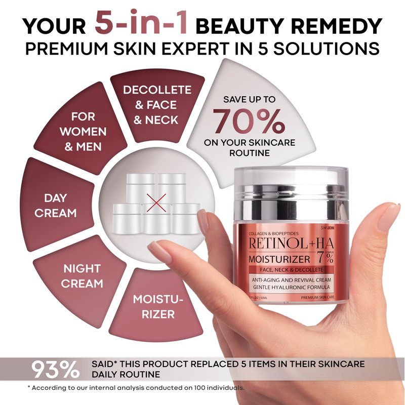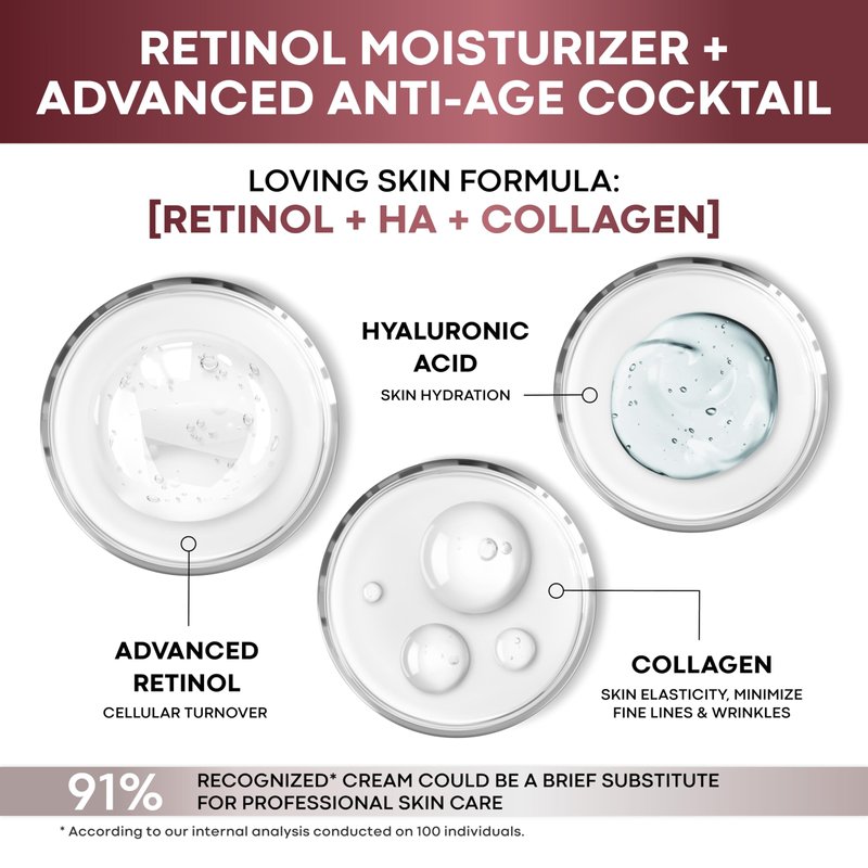 - Natural Ingredients: retinol and collagen face cream for women & men helps improve skin texture; vitamins С, B, E to support skin elasticity & firmness; aloe to aid with dark spots & signs of fatigue.