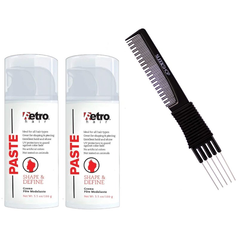 Retro Hair PASTE for All Hair Types, Shaping & Piecing (w/ Sleek Premium Carbon Teasing Comb) Hold & Shine like gel, pomade, cream, clay (3.5 oz / 100 g (PACK OF 2))