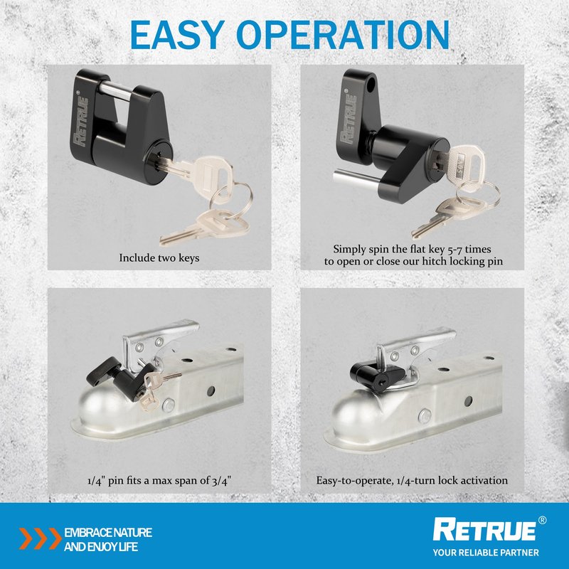 Retrue Trailer Hitch Coupler Locking Pin Design:1/4 Inch diameter tongue lock pin with effective length 3/4 Inch. Small size for easy carrying. Keeping the coupler lock in your pocket or vehicle anywhere that is fine. Please verify dimension and length of the pin you want before purchasing our coupler hitch lock pin. How To Operate Our Trailer Tongue Coupler Lock: Spinning the flat key 5-7 times to open or close the hitch lock. Security Of Our Coupler Locking Pin: This trailer lock is made of high-strength steel to deter theft. The hitch lock is coated with black electrophoretic paint to prevent corrosion. Coupler Locking Hitch Pin's Application: Tow Trailer Boat RV Truck Car Retrue, a reliable brand in Hitch Sercurity Industry, we offer 30-day money-back for any reason, 12-month warranty for quality-related issues.