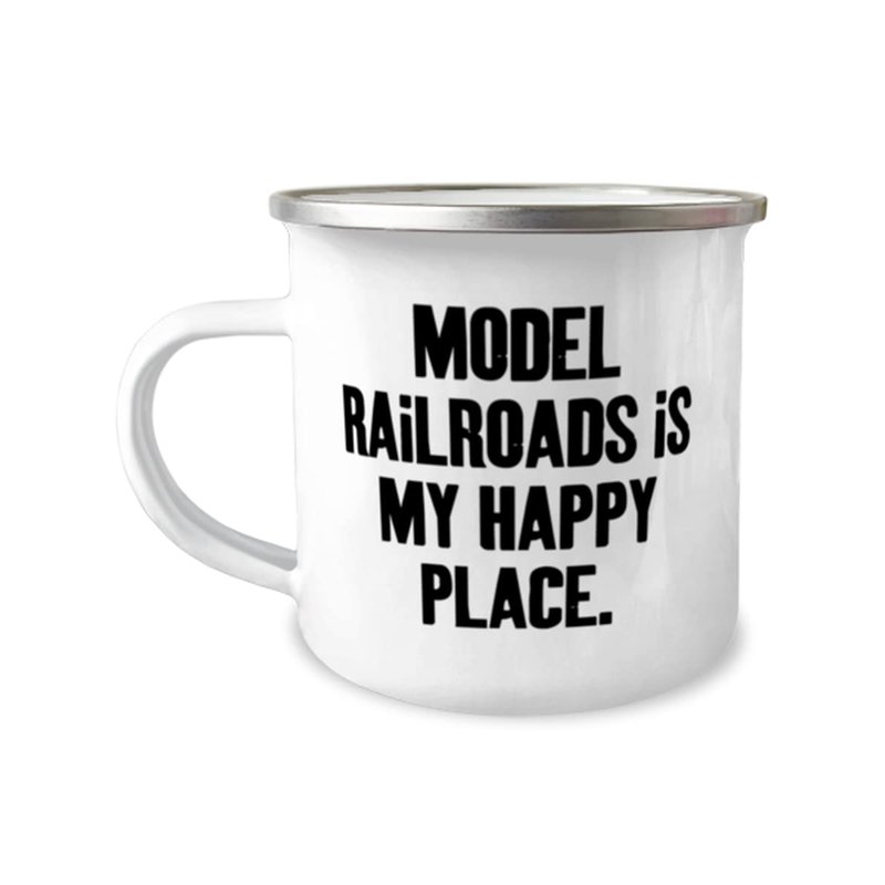Reusable Model Railroads 12oz Camper Mug, Model Railroads is My Happy Place, Joke Gifts for Friends, Birthday Gifts, Model train set, Toy trains, Train tracks, Railroad toys, Electric trains, Battery