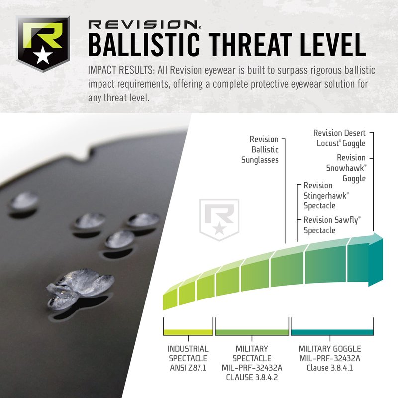 - Revision Military Desert Locust Goggles – Our flagship goggles combining maximum ballistic protection with a perfect facial and helmet fit. Built to exceed stringent U.S. and international ballistic impact requirements.
