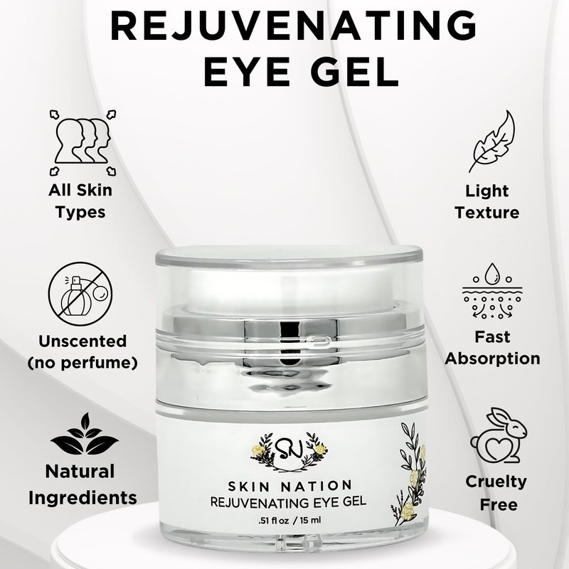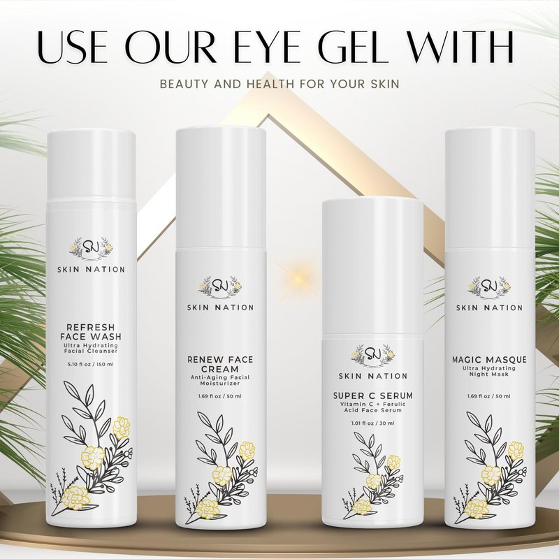 Rejuvenate Your Eyes with Skin Nation's Eye Rejuvenating Eye Gel Our eyes are often the first area to show signs of aging and stress. Dark circles, puffiness, and fine lines can leave you looking tired and older than you feel. If you're searching for an effective solution to address these concerns, look no further than Skin Nation's Eye Rejuvenating Eye Gel. This remarkable eye serum combines key ingredients and we'll explore the benefits of this eye cream. Collagen for Firmness Collagen is the structural protein that keeps your skin firm and youthful. Skin Nation's eye cream anti aging features collagen, which helps improve skin elasticity around the eyes, reducing the appearance of fine lines and crow's feet. Vitamin C for Brightening Vitamin C is a powerful antioxidant that brightens and rejuvenates and our under eye brightener contains vitamin C, making it an excellent choice for those looking for an eye cream for dark circles, our eye gel helps reduce dark circles and promote a more even skin tone. Eye Cream for Dark Circles and Puffiness Skin Nation's Eye Rejuvenating Eye Gel is specifically formulated to combat dark circles and puffiness. It's not just an under eye cream; it's a targeted treatment for those common under-eye concerns. Say goodbye to the tired look and hello to a revitalized, more youthful appearance. Anti-Aging Elegance As a wrinkle cream, this gel is designed to reduce the appearance of fine lines and wrinkles around the eyes and Skin Nation's Eye Rejuvenating Eye Gel can help you achieve a smoother, more youthful look. Skin Care for All Skin Types This eye gel is suitable for all skin types, making it an inclusive option for your skincare routine. In conclusion, our Rejuvenating Eye Gel combines the power of collagen and vitamin C to make an elegant eye cream for puffiness and bags under eyes and under eye cream for dark circles. So elevate your skin care products regimen with this exceptional eye gel, and experience the transformat