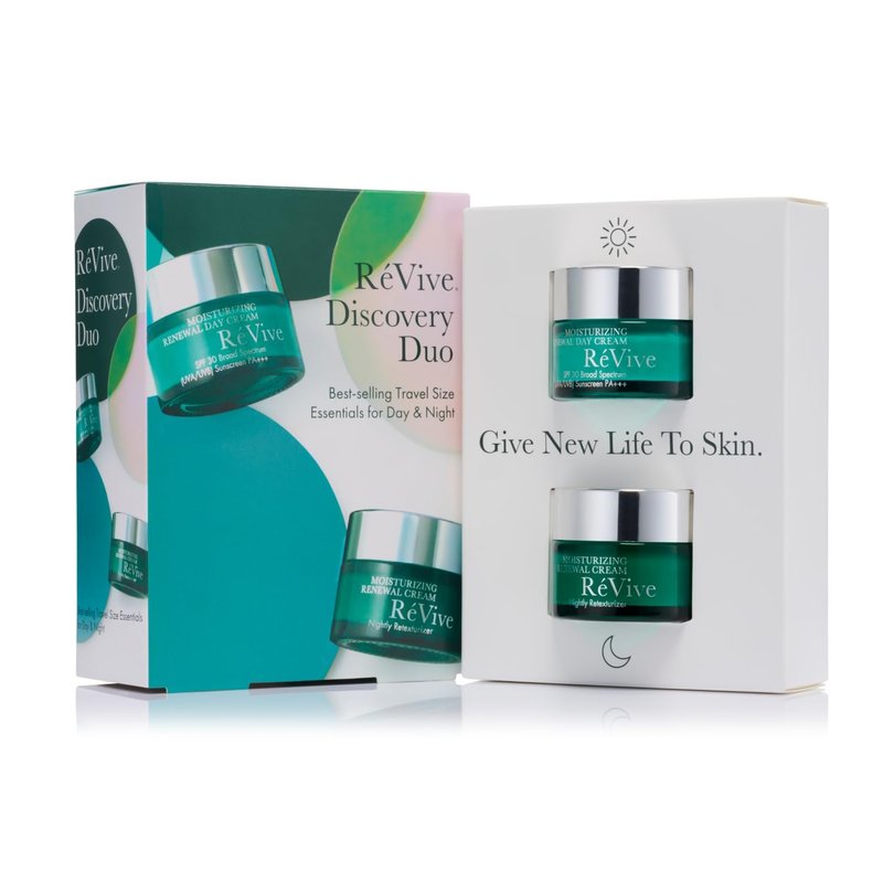 - RéVive's Travel Essentials - Introducing our fan-favorite formulas powered by Bio-Technology to renew skin and visibly diminish fine lines. This skin-perfecting duo moisturizes day and night for glowing, smoother, younger-looking skin. Kit includes a moisturizer with SPF and a night face cream.