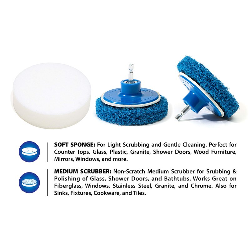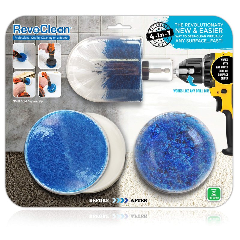 - Non-Scratch Goodness: The medium scrubber is effective on polishing and scrubbing glass, shower doors, bathtubs, stainless steel, granite, chrome, sinks, fixtures, cookware, tiles, and more.A Powerful Clean: Attaching RevoClean to your power drill creates a high-powered cleaning tool just like the professionals use. Surface and car detailing has never been easier or faster.Included Attachments: One medium stiffness nylon round brush, one medium stiffness nylon ball brush, one 2-sided non-scratch nylon scrubber, one 2-sided soft sponge (Drill not included! ).90-Day : We're so confident you'll love your RevoClean cleaning kit that we'll give you 90 days to try it out. If you don't love it, simply return it, no questions asked. (Drill not included! )