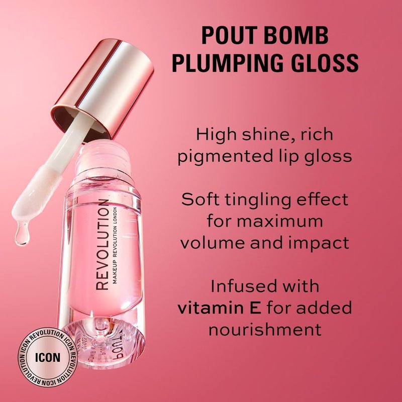 Revolution Beauty, Pout Bomb Plumping Lip Gloss, High Shine, Rich Glossy Pigment, Infused with Vitamin E, Kiss Nude, 0.15 Fl. Oz.