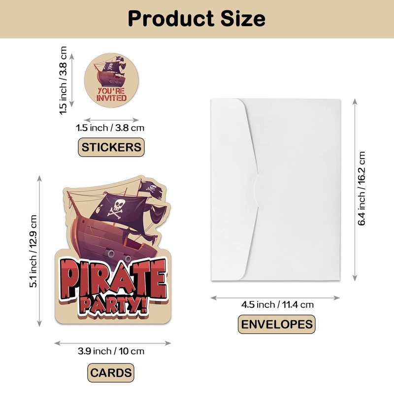 - Pirate Birthday Party Invitation Sets: There are 15 pirate ship shaped invitation cards, 15 premium white envelopes and 15 matching envelope seal stickers in this package. These beautiful invitations will make your party the talk of town and make the guests excited to come and participate.