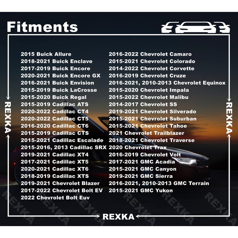Fits: Buick: Enclave, Encore GX, Envision, LaCrosse, Regal Sportback, Regal TourX Cadillac: ATS, CT4, CT5, CT6, CTS, Escalade, Escalade ESV, XT4, XT5, XT6, XTS Chevrolet: Blazer, Bolt EUV, Bolt EV, Camaro, Caprice, Colorado, Corvette, Cruze, Equinox, Impala, Malibu, Silverado 1500, Silverado 1500 LD, Silverado 2500 HD, Silverado 3500 HD, SS, Suburban, Tahoe, Trailblazer, Traverse, Volt GMC: Acadia, Canyon, Sierra 1500, Sierra 2500 HD, Sierra 3500 HD, Terrain, Yukon, Yukon XL