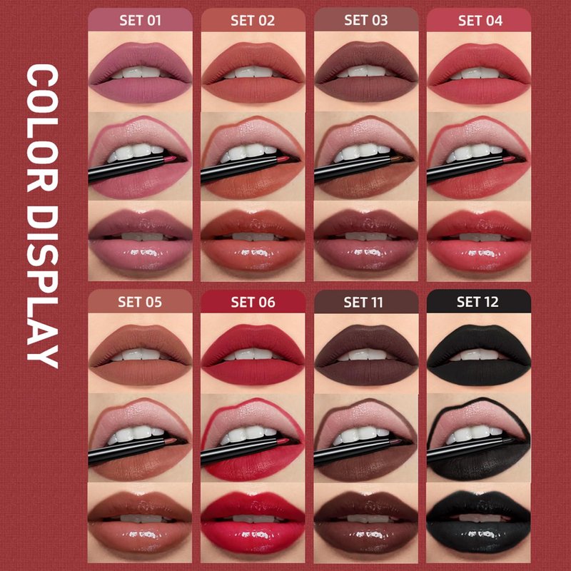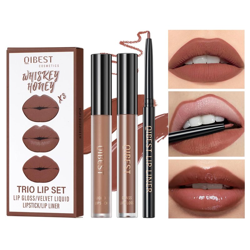 Our three-in-one lipstick set includes matte lip gloss, moisturizing lip gloss, and 2mm lip liner, making it a high-performance, multi-functional cosmetic product. The matte lip gloss provides a soft matte effect that stays all day, perfect for daily work and social occasions. The moisturizing lip gloss adds moisturizing ingredients to the matte foundation, keeping your lips hydrated and glossy, suitable for special occasions and dry seasons. The 2mm lip liner enables precise application and definition, ensuring you have perfect lip shape every time. The set includes three beautiful shades that are suitable for any skin tone. This set is a must-have for any makeup enthusiast, helping you create perfect lips for both daily makeup and special occasions. Come and give it a try!
