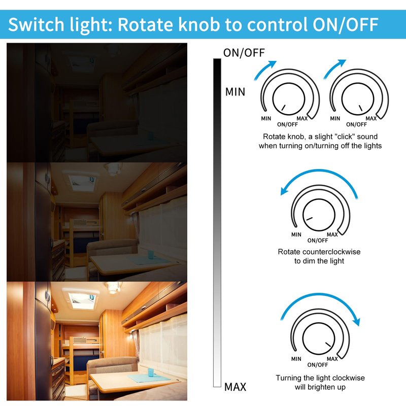 - STEPLESS DIMMING FLICKER FREE: 12V DC dimmer switch can achieve 3-100% stepless dimming, without noise and flashing. You can easily adjust the light according to different environment needs, energy- saving and extend the life of the bulb, creates a best atmosphere in your rv.