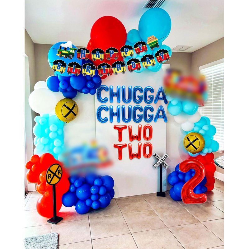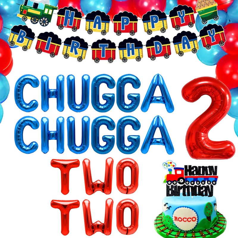 - You will get: 2 x train balloons, 1 x train birthday banner, 20 x latex balloons, 1 x train birthday cake topper, 1 x chugga chugga two two balloons, 1 x 30 inch “2” letter balloon ,as shown