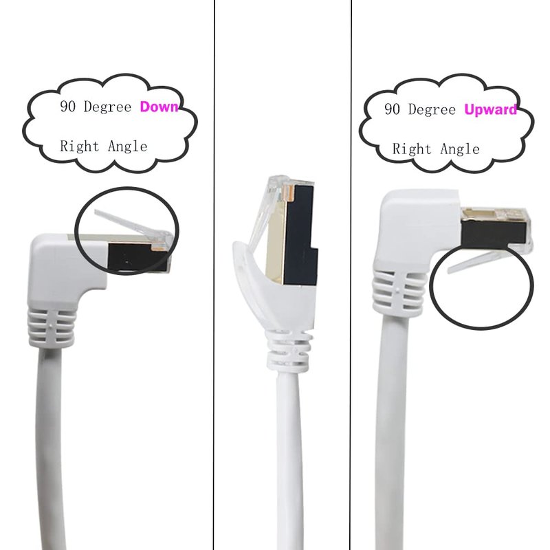 - ETHERNET EXTENSION CABLE---2 kinds of 90 degree RJ45 connectors (upper, lower) can be better used in narrow space, fit your laptop tightly or connect to network wall plate behind furniture, prevent cable from bending, increase service life