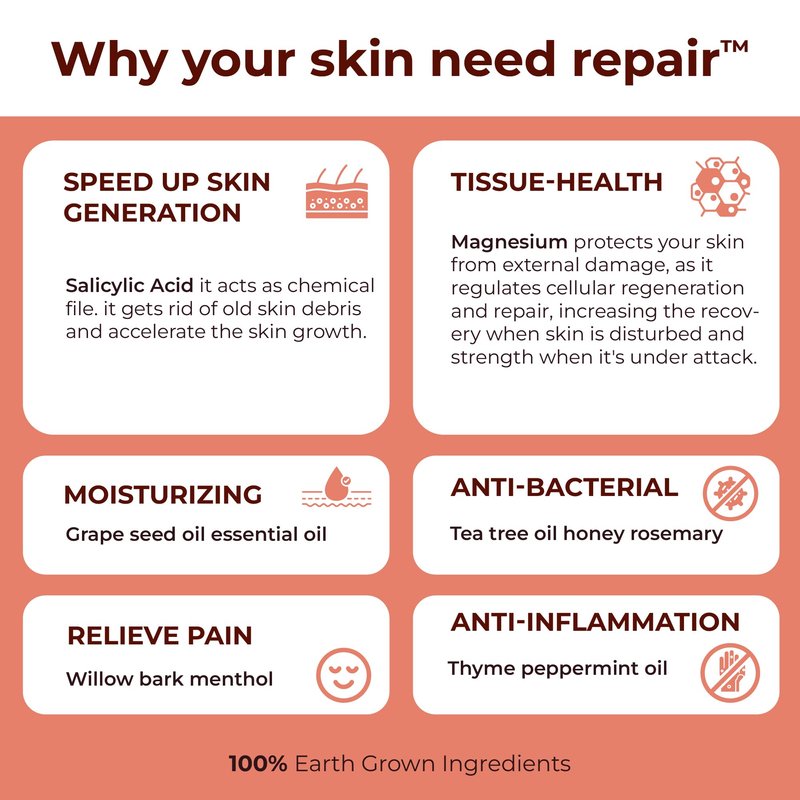- EARTH GROWN INGREDIENTS: To create our Rhino Repair skin cream, we chose the best natural ingredients known to contribute to skin health. We used Grapeseed oil to condition and strengthen your skin, honey to heal cracks and wounds, peppermint oil and thyme to help with the inflammation, and tea tree oil to help clean and heal your skin.