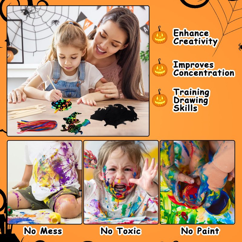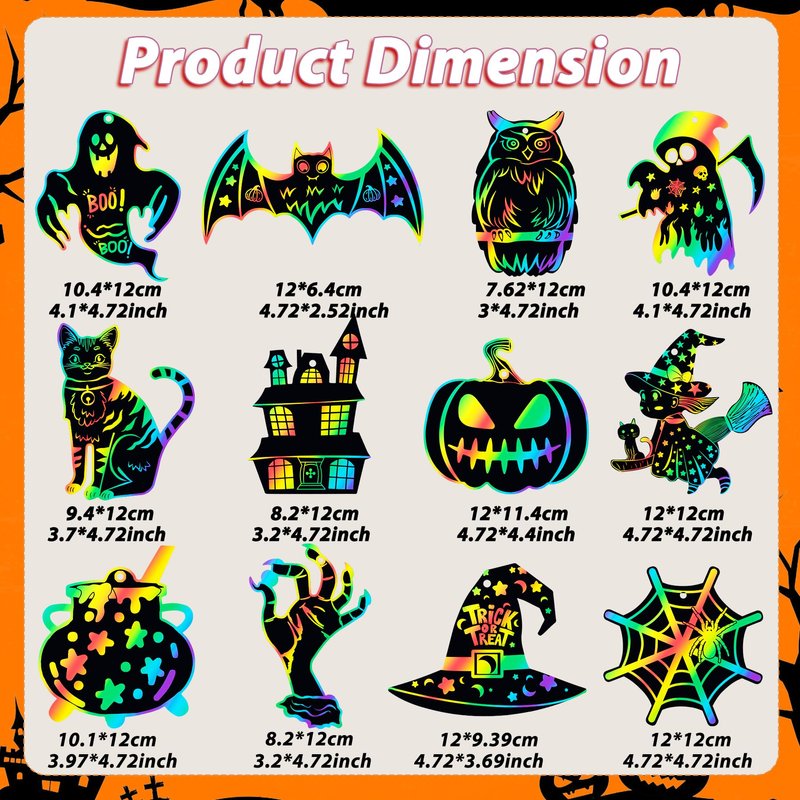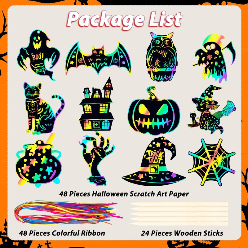- Unleash Your Creativity - Get ready to bring your ideas to life with our generous assortment of supplies! Dive into a world of imagination with 48 Halloween rainbow scratch papers, each featuring one of 12 captivating patterns (4 pieces per design). Plus, you'll also receive 48 mixed-color bands and 24 wooden sticks - everything you need to fuel your crafting passion.