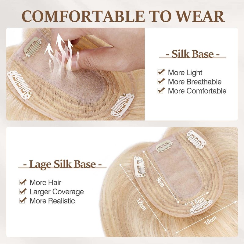 - ❤ 120% DENSITY Silk Base Topper: Compared to 100% density, our clip in topper has denser hairline, thicker top hair and the closest appearance with real human scalp ,it is very natural and no one will find your secret.Base size:(3.9”x4.7” approximately).