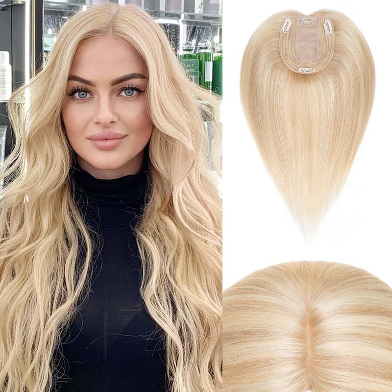 Rich Choices 100% Remy Human Hair Clip in Topper Silk Base Top Hairpiece for Women Hand-made Toppee Hair piece 120% Density Middle Part with Thinning Hair 10 Inch #18P613 Ash Blonde&Bleach Blonde 35g