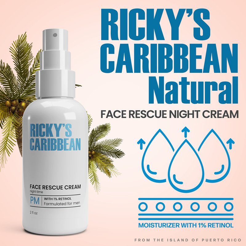 Ricky's Original skin cream has natural and organic ingredients designed specifically for men. Our menβs face cream developed on the Island of Puerto Rico using ocean minerals will give you strong night time protections (1% retinol) and repair/correct to improve elasticity and tone. The formula is free of artificial fragrances and colors, parabens, sulfates, animal products and alcohol. Our moisturizer is still nourishing enough that your skin wonβt go back to that dry, cracked feeling as the day goes on. Nourish and protect as it infuses skin with hydration that will last throughout the night and day.