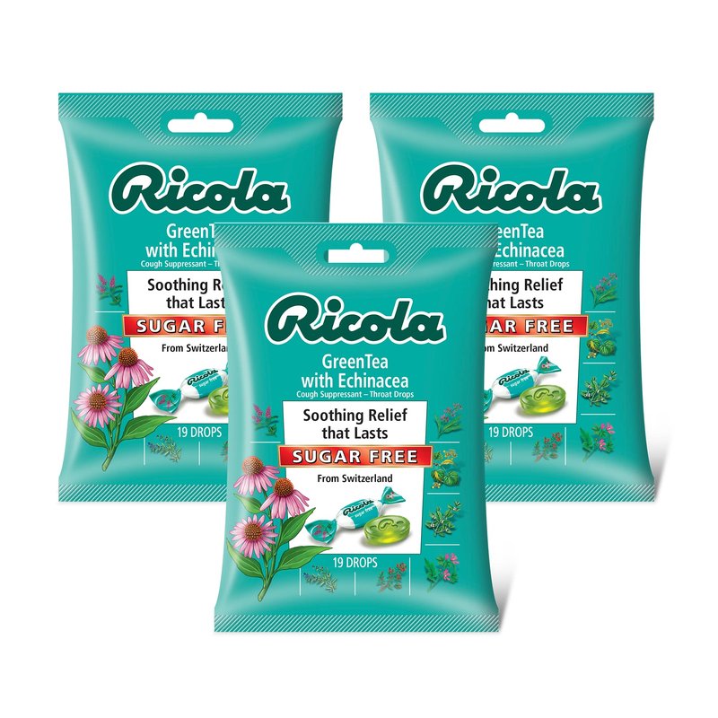 • RICOLA SUGAR-FREE GREEN TEA WITH ECHINACEA THROAT DROPS: Delicately flavored with natural green tea, Echinacea and the added goodness of mountain grown Swiss herbs. These drops are uniquely delicious and distinctly Ricola. Active Ingredient (in each drop): Menthol, 4.8 mg