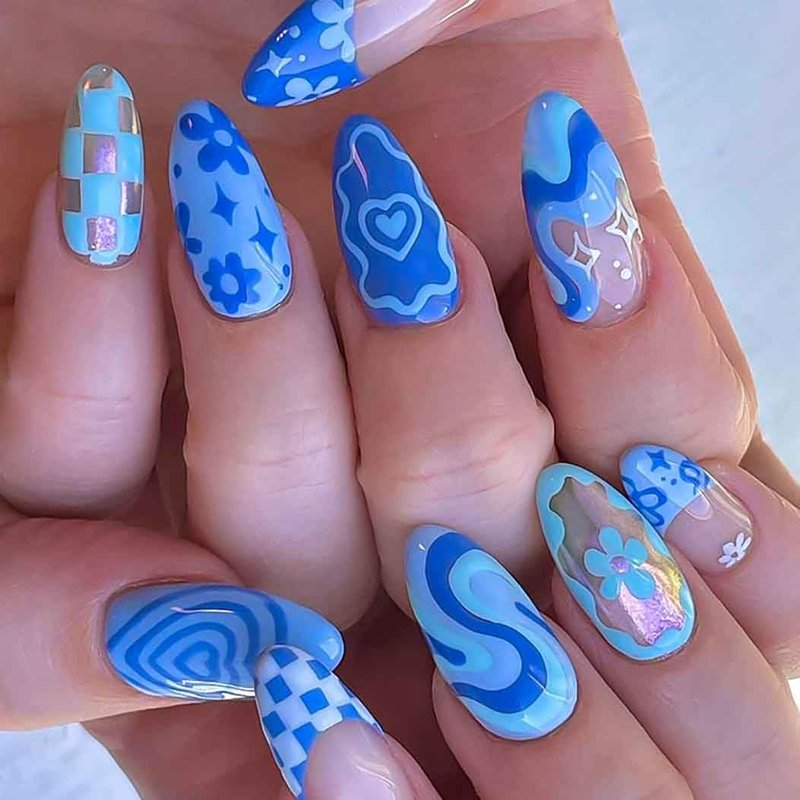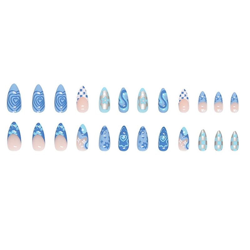 RikView Blue Press on Nails Long Fake Nails Almond Acrylic Nails Glossy Full Cover Nails 24 PCs/Set