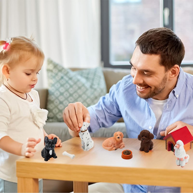 - Home Decor: Featuring realistic details, including a golden retriever, poodle, teddy, dalmatian, and French bulldog, this set also comes with a dog house, bone, and food bowl for immersive play.