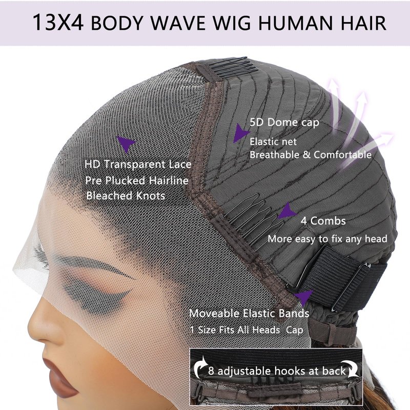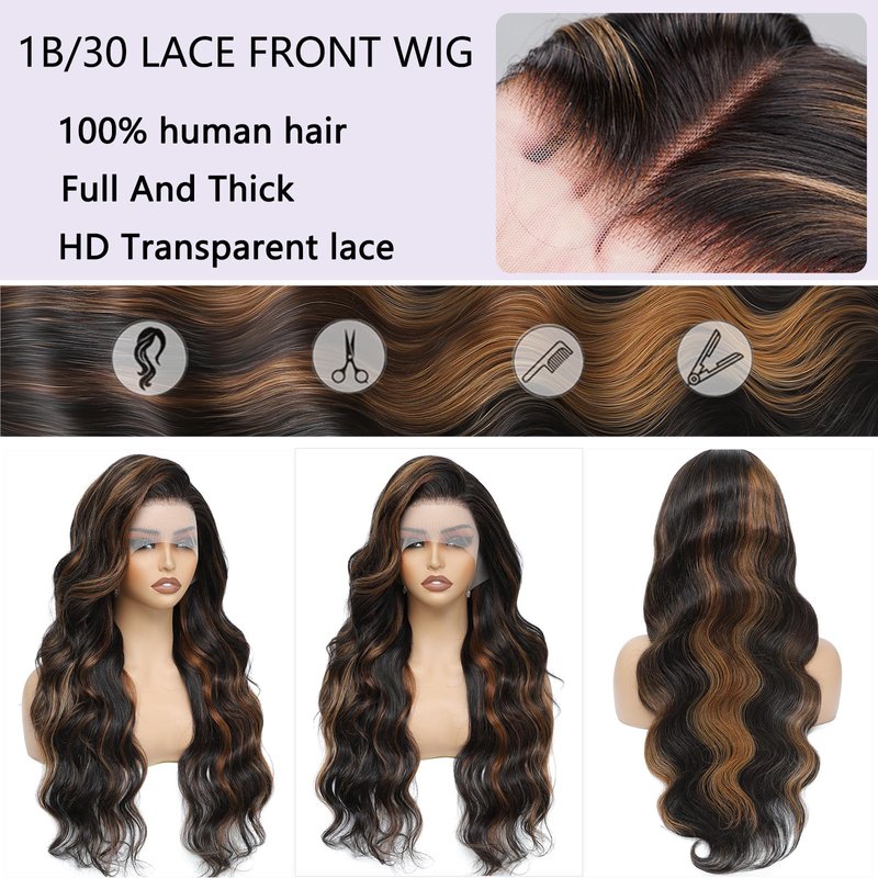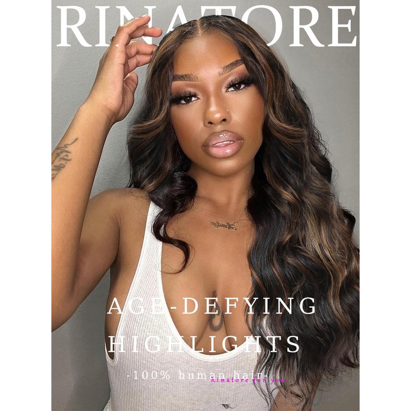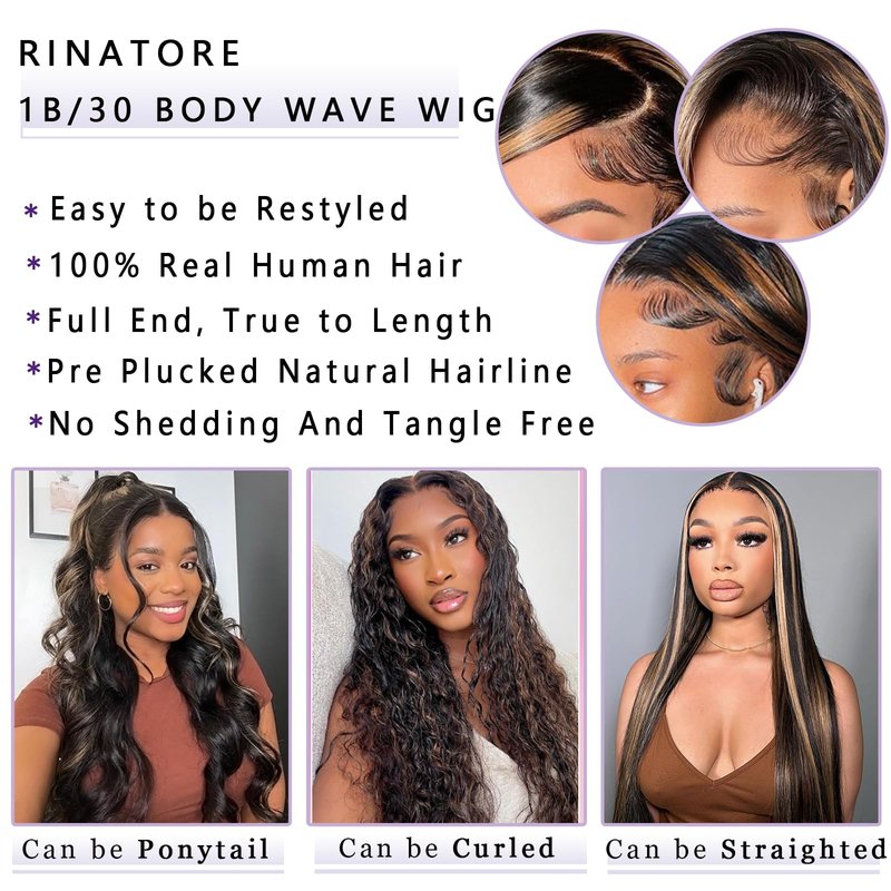 - Body Wave Highlight HD Lace Frontal Wigs Lace: 13x4 free part big lace parting space, can match with any skin tone, comfortable against skin, pre plucked with natural hairline, proper bleached knots, enough baby hair around, looks more natural and attractive.