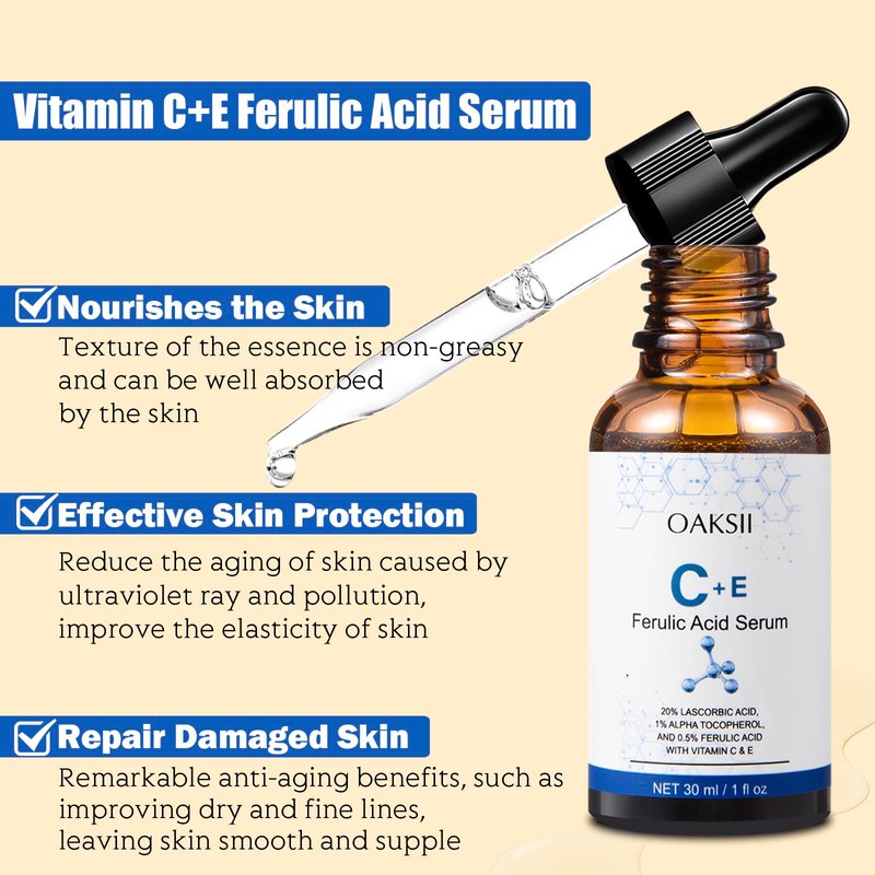 Benefits: Vitamin C has strong reducing properties, can resist oxidation, delay the aging process of the skin, promote skin metabolism, improve skin condition, and has a good effect on skin tenderness and smoothness Volume: 1.0 Fl oz Main Ingredients:Lascorb acid , α- Tocopherol , Ferulic Acid , Vitamin C & E How to Use: 1.After cleaning and toning, apply 2-4 drops onto the face 2.Gently patting to allow absorption 3.Use twice a day for best results 4.Safe for all skin types and hypoallergenic