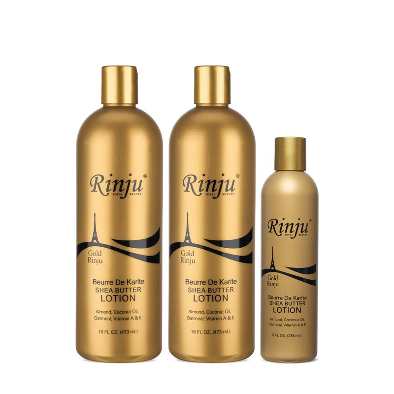Rinju Gold Shea Butter Lotion provides your skin with ultimate moisture and protection every day. Enriched with pure shea butter which smooths and softens all skin types while restoring its youthful glow. Its exotic fragrance blended with essential oils provides the ultimate relaxing experience.