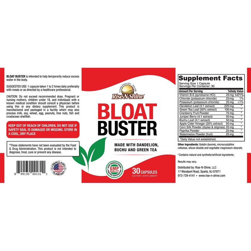 Bloat Buster is formulated with a unique combination of water-releasing vitamins, minerals and herbs including: Vitamin B-6, Potassium, Dandelion, Green Tea, Cranberry, Juniper Berry, Buchu Leaves, Apple Cider Vinegar, Corn Silk and more! Rise-N-Shine's Bloat Buster water supplement can temporarily help you lose water, associated with water retention. Supplements and Vitamins are an important part of a daily routine. Rise-N-Shine stands by all of its products, so you can try all of Rise-N-Shine vitamins and supplements with confidence. We never compromise on quality or service and stand behind every Rise-N-Shine product.