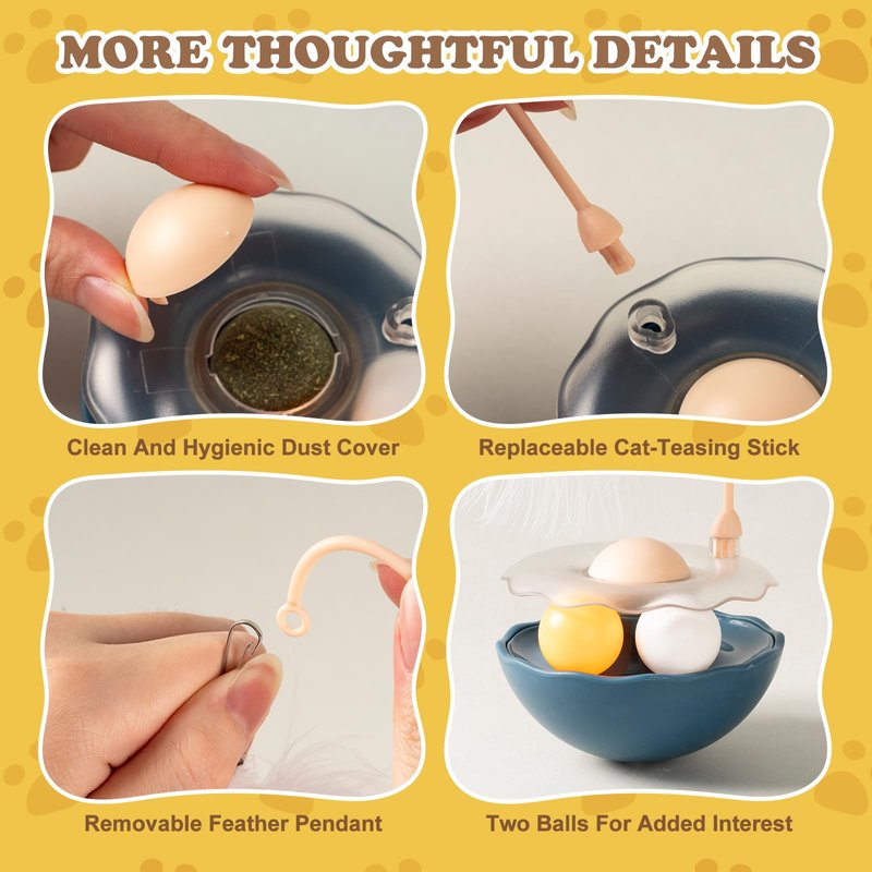 • Entertaining Cat Toy: Interactive cat toys is with a tumbler design, allowing the funny toy to interact with your pets. The teaser with feather and bell can trigger cats' hunting instincts. Two track balls spinning can arouse your cat's curiosity.