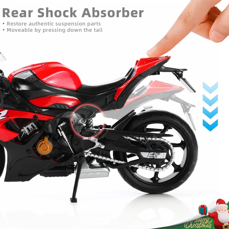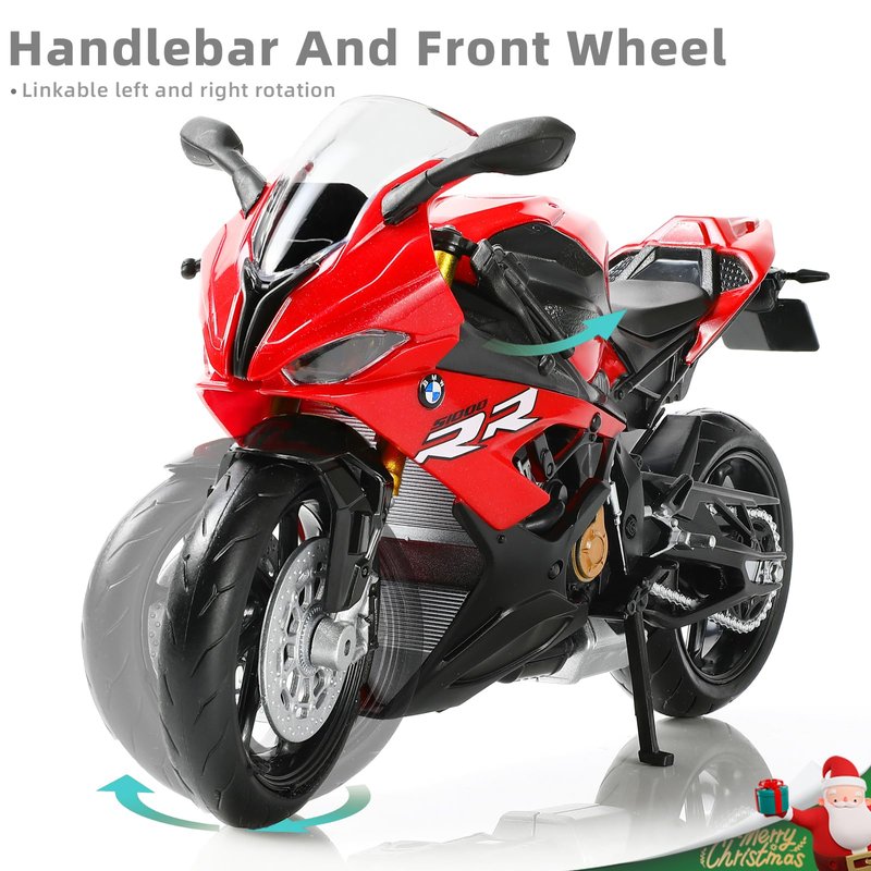 - 【Material & Highlight】-The main body of the S1000RR motorcycle model is made of alloy diecast motorcycle model materials and high-quality plastics,the tire part is made of rubber.The intricate details such as rotatable support pedals, twistable front wheels also enrich the motorcycle toy's realism and appeal. This design not only ensures the excellent durability of the motorcycle model toy 1/12, but also enhances the overall authenticity and collection value of the 1/12 motor model toy.