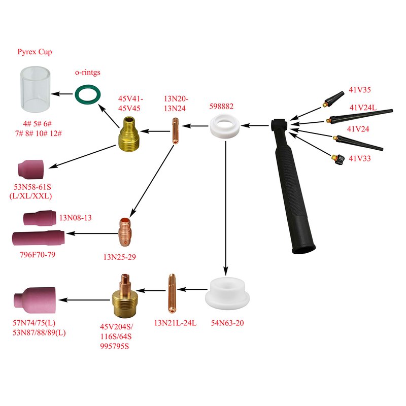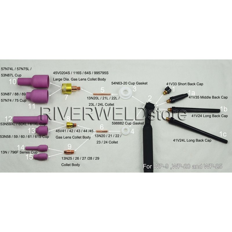 RIVERWELD TIG Gas Lens Collet Body 13N21 45V42 (.040" & 1mm) 13N22 45V43 (1/16" & 1.6mm) 45V44 13N23 (3/32" & 2.4mm) 45V45 13N24 (1/8" & 3.2mm) Glass Cup #4 ~ #12 WP 9 20 25 TIG Welding Torch 39pcs