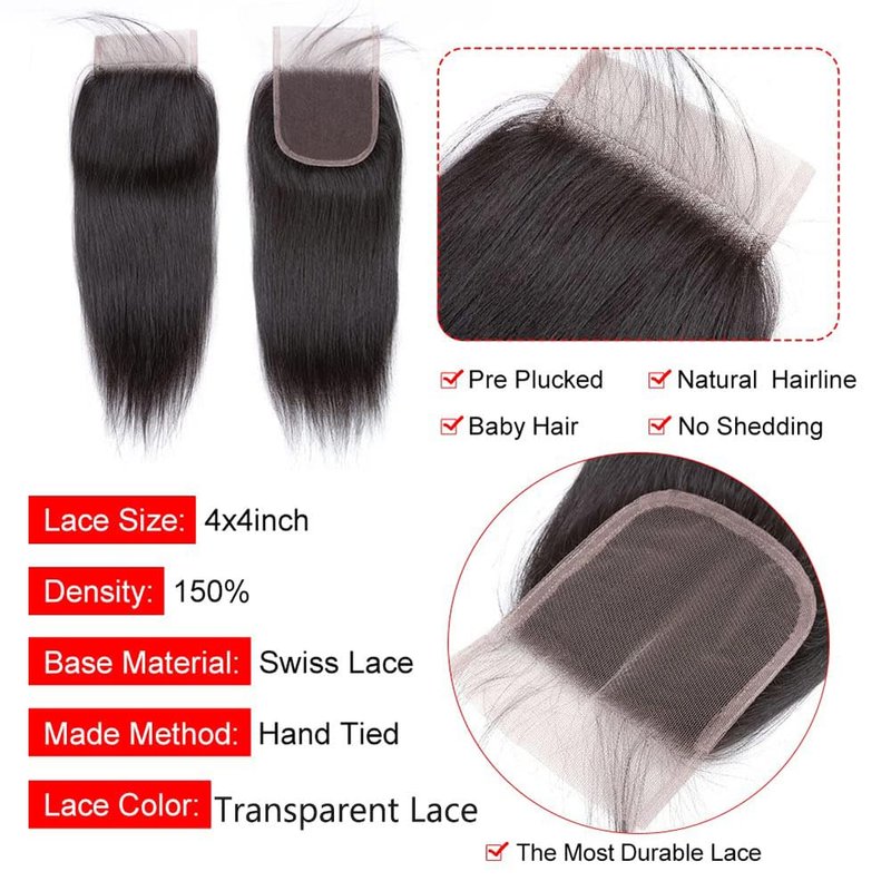 - 3.Straight 4x4 Lace Closure Natural Hairline Pre Pluck with Baby Hair.150% Density Human Hair Straight Lace Closure.Full Looking and Super Natural.Parties,Birthday,Travel,Celebration,Wedding,Gifts and Daily Life,Make You More Charming and Confident.