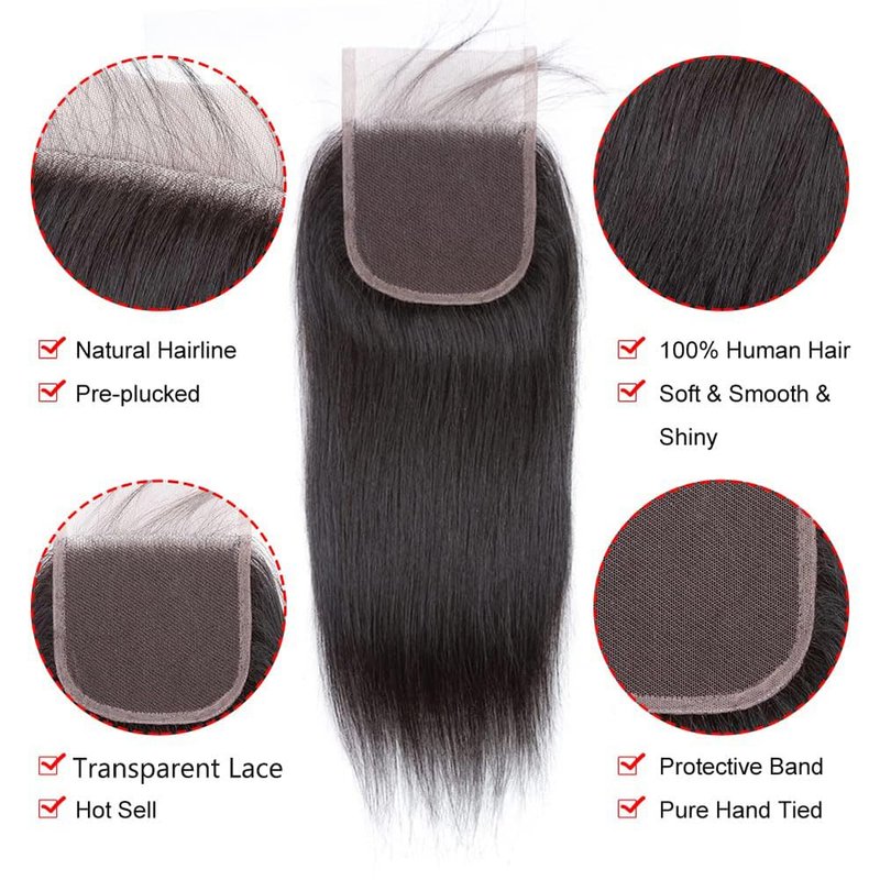 - 1.100% Unprocessed Brazilian Virgin Remy Human Hair Straight 4x4Transparent Swiss Lace Closure,Free Part Closure Human Hair 12A Top Natural Black Hair from Young Girls Donor.No Chemical,No Shedding,No Tangles,Soft,Smooth,Healthy.