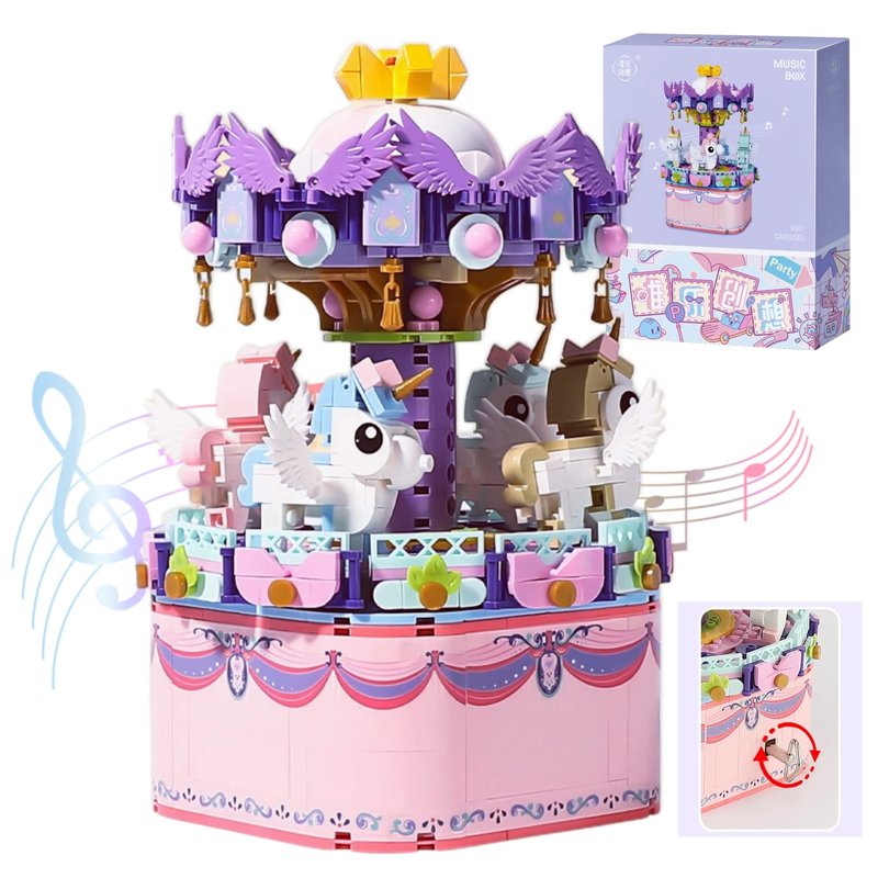 - [What Do You Get]- The Street View Carousel Music Box Bricks Model Set is an amazing DIY building block set that comes with 874 pieces, Its size is 7.28x4.53x4.53in.