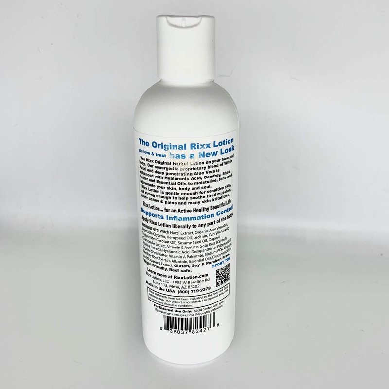 Rixx Lotion Original is made with Witch Hazel, Aloe Vera, Shea Butter, Hyaluronic Acid and Essential Oils. Rixx Lotion offers a unique combination of natural ingredients and is a deep penetrating moisturizer and skin toner in one. Rixx is an amazing body and face lotion for all ages.