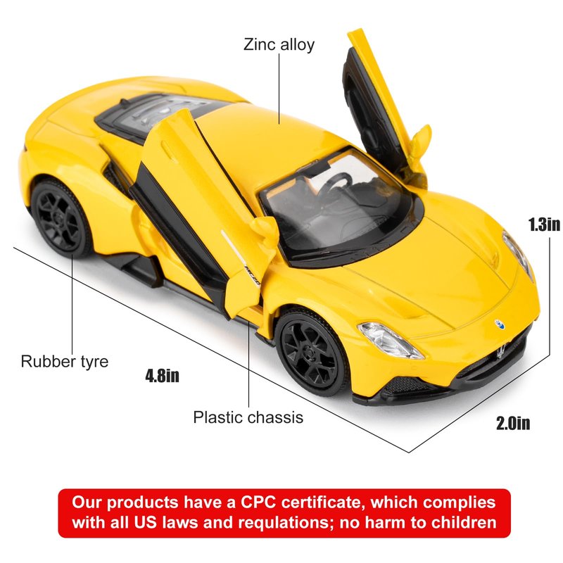 RMZ City Alloy Toy Car, 1/36 Scale Maserati MC20 Diecast Model Car, Toy Car with Pullback Function, Model Toys for Collecting and Decorating, Car Gifts for Boys and Girls (Yellow)