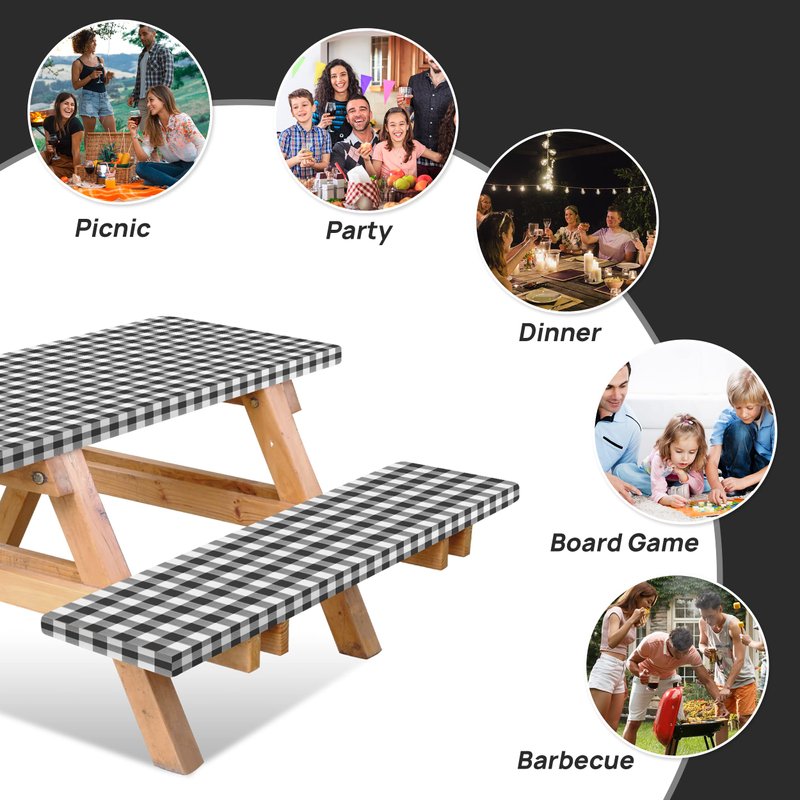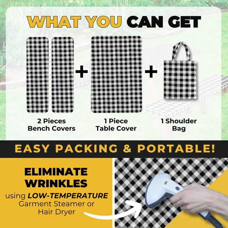 Keep Your Tables Clean, Protect Your Kids from Splinters, Do away With Clips that Always Get Lost!Instantly transform any table into a beautiful, clean, and appealing place to eat and enjoy a comfortable and mess-free camping trip or just a family picnic at home, take this 3 piece picnic table cover with bench covers and bag with you!