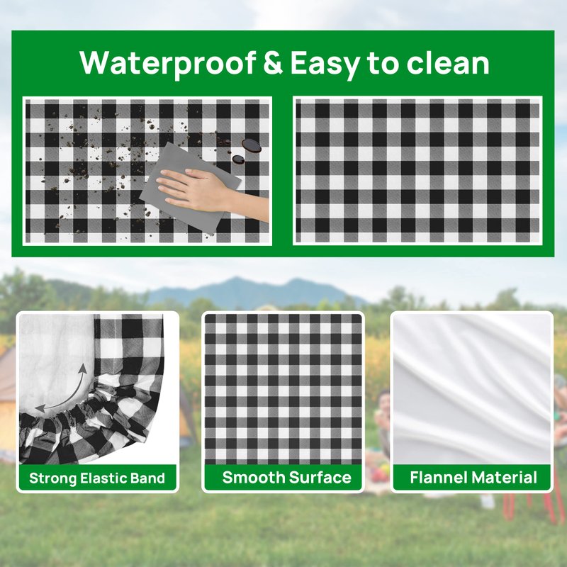 - No more dirty tables & benches, No more splinters & messy accidents when the wind blows. Elastic corners and soft flannel backing will keep the picnic table cloths securely snug and tight fit in place without CLIPS