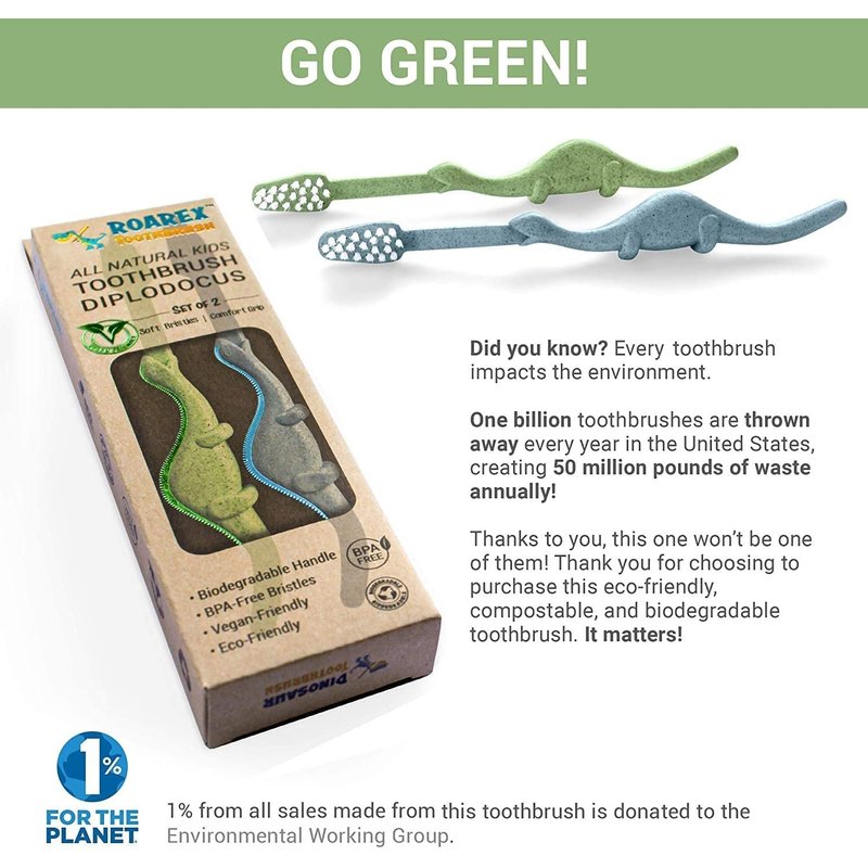 ROARex® All-Natural Eco Friendly Kids Toothbrush Made from Plants - Dinosaurs 4-36m - Baby to Toddler - Blue/Green - 4pk | 1% for The Planet Product