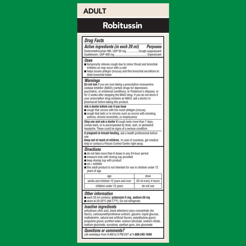 - Two 8 fl oz bottle of Robitussin Maximum Strength Elderberry Cough Plus Chest Congestion DM Cough Medicine for Adults, Cough and Chest Congestion Relief Non Drowsy Liquid