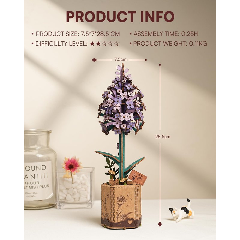 - 【ROBOTIME Model Flower Kit】Our Timeless Wooden Lilac, with its exquisite details and pre-colored petals, radiates vibrant, lasting beauty in any room. Symbolizing enduring love and joy, these flowers never wilt, making them a perfect keepsake.