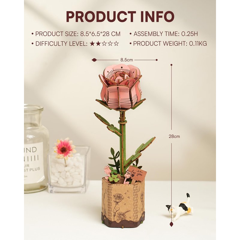 - 【ROBOTIME Model Flower Kit】Our Timeless Wooden Pink Rose, with its exquisite details and pre-colored petals, radiates vibrant, lasting beauty in any room. Symbolizing enduring love and joy, these flowers never wilt, making them a perfect keepsake.