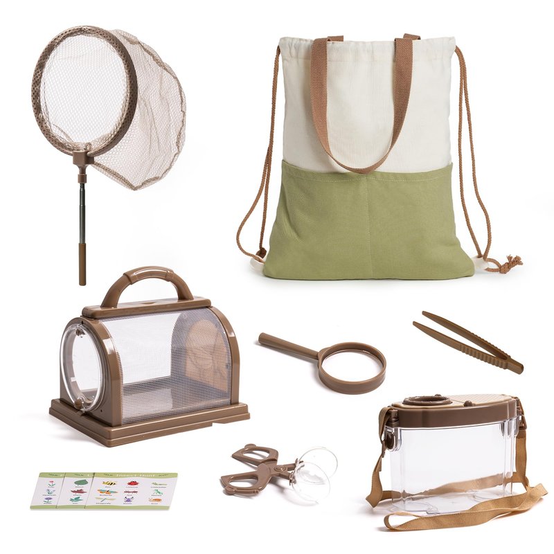 • 8 pcs Outdoor Explore Kit:Including transparent box, magnifying glass,telescopic net, clamp, tweezers,container,cards, and carry bag, which realistic accessories help kids to explore nature with endless fun.