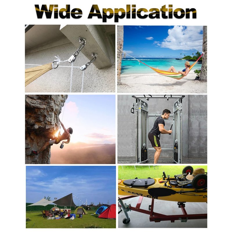 - WIDE APPLICATION - Rope pullies are suitable for wire rope/cord to pass and pull objects. Perfect for clothesline pulley, boats, mining, dog leashes, garages, key chains, camping, fitness, small diameter cables, curtains, rock climbing, hanging objects.
