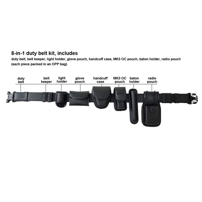 - 8-in-1 Police Duty Utility Belt kit includes-2 inch duty belt, handcuff case, radio pouch, light holder, belt keeper, baton holder, MK3 holder