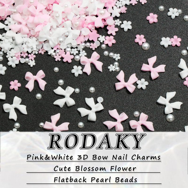 RODAKY 1000PCS Pink Bow Nail Charms White Bowknot Charms for Nail Resin Flatback Nail Pearl Beads Flower Charms Valentine's Day Nail Decoration Accessories for Women Manicure DIY