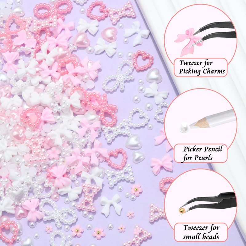RODAKY Bow Nail Charms 1000PCS Pink&White 3D Bow Nail Charms Multi Shape Nail Decoration Flatback Pearl Beads Flower Charms Nail Accessories with Tweezer Pickup Pencil
