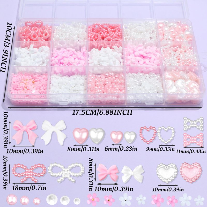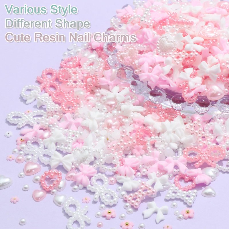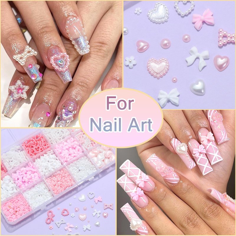 - Vaious Shape&Size:This set contains different style cute charms,including bowknot nail charms,3d heart, flower shape charms and flatback pearl beads in pink and white color.For each style,there are enough quantity and different size for you to choose.