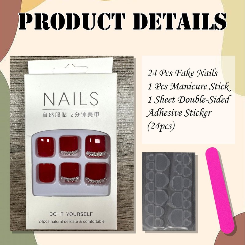 - Packing: The False Toenail Kit Has 24 Fake Toenails, 12 Different Sizes Of Nails, 1 Double-Sided Sticker And Nail File.