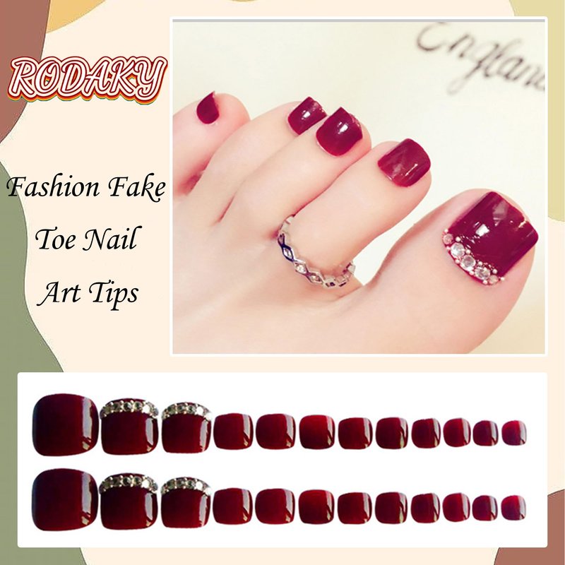 RODAKY Press on Toenails for Women Red Rhinestone False Nail for Toe Full Cover Fake Toenail Fashion Nails Artifical Toenails Acrylic Foot Nail Tips 24Pcs